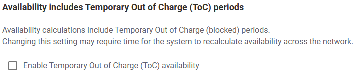 Check the Enable Temporary Out of Charge (ToC) availability option so that the Availability calculations include Temporary Out of Charge (blocked) periods.