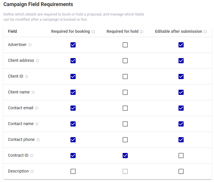 This setting determines whether users are required to fill out the selected field when booking or submitting campaigns to our Broadsign Control solution.