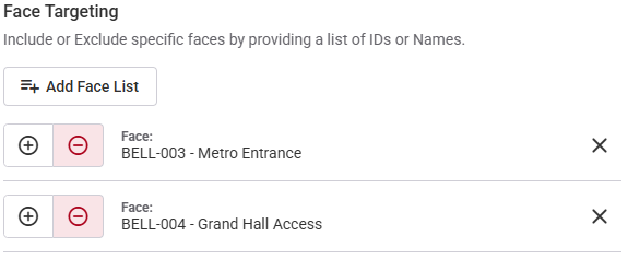 You can include or exclude specific screens or faces by providing a list of IDs or Names.