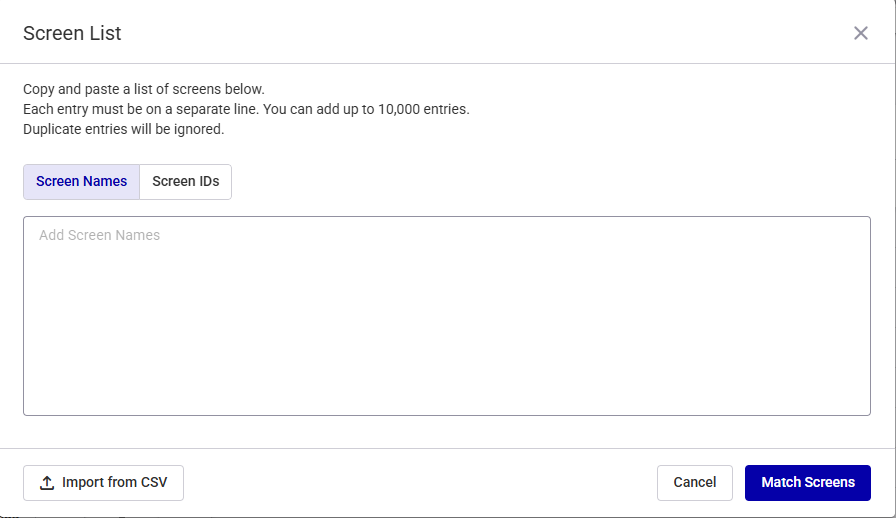 - Copy and paste a list of Screen IDs, Screen Names, Face IDs, or Face Names in the input field.