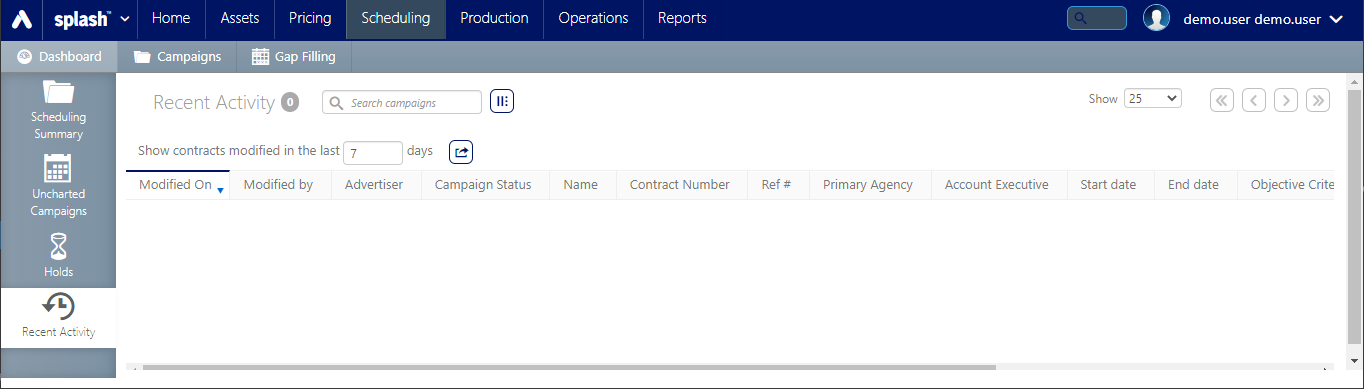 The Recent Activity dashboard displays campaigns modified for a user-defined period of time.