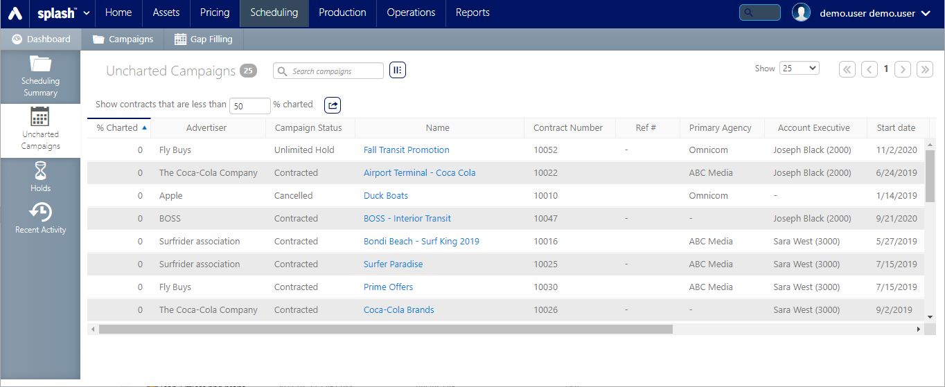 | Show Contracts that are less than % charted | Shows the campaigns that are charted to less than a user-defined percentage value. |
