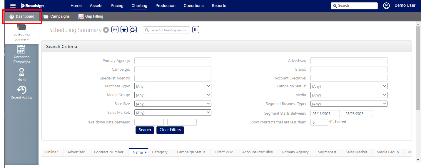 The Scheduling Summary dashboard provides the necessary Segment information at a higher level. It displays a list of your scheduling according to filters that you can set.
