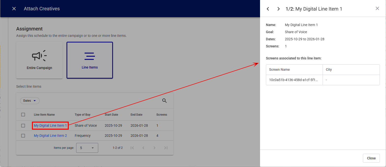 You can click a line item name, which will display the details of the line item, including the screens targeted.