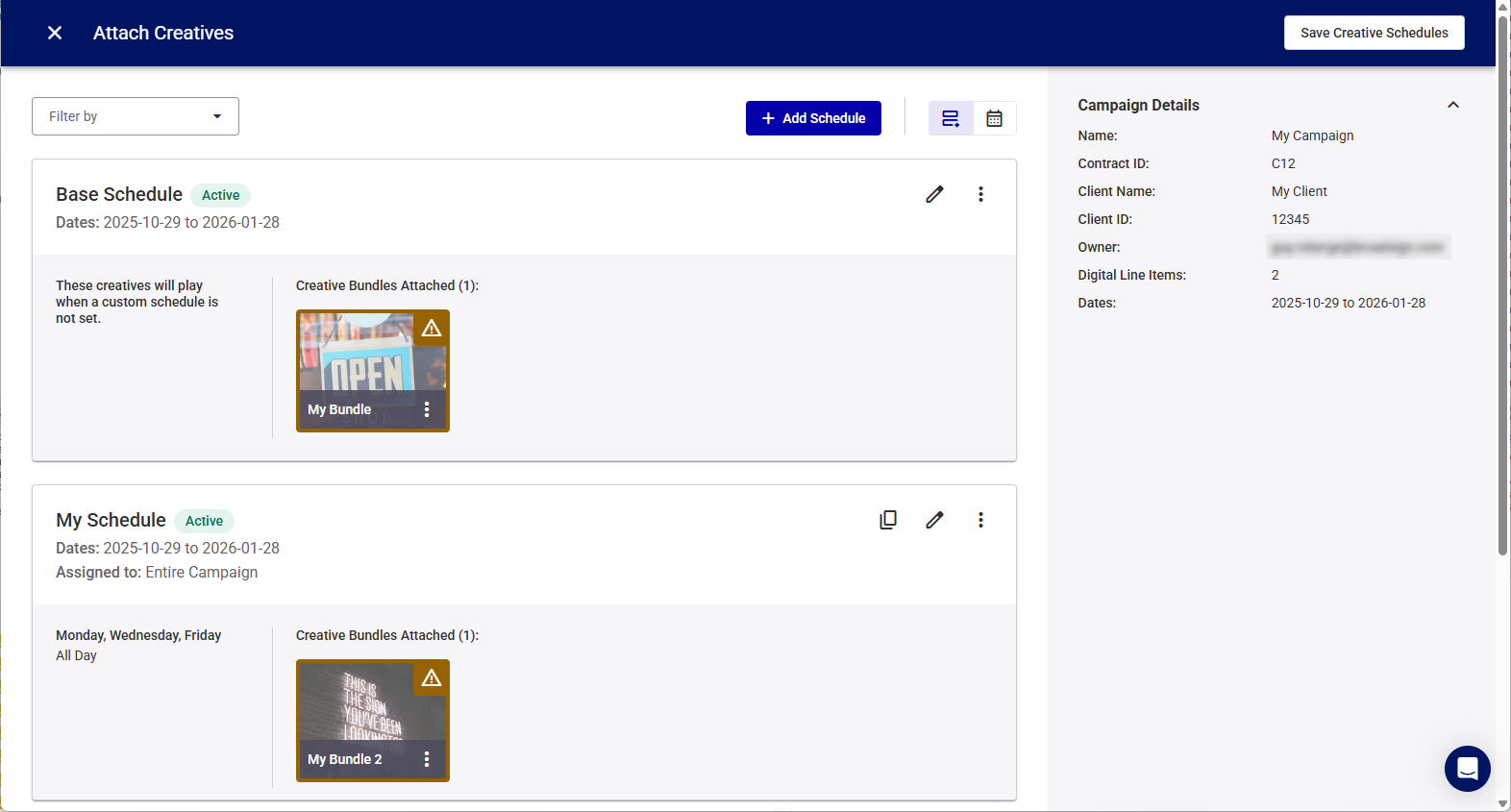 Once a bundle is created and listed in the Creative Bundles page, you can assign it to your campaign and create one or more schedules for it.