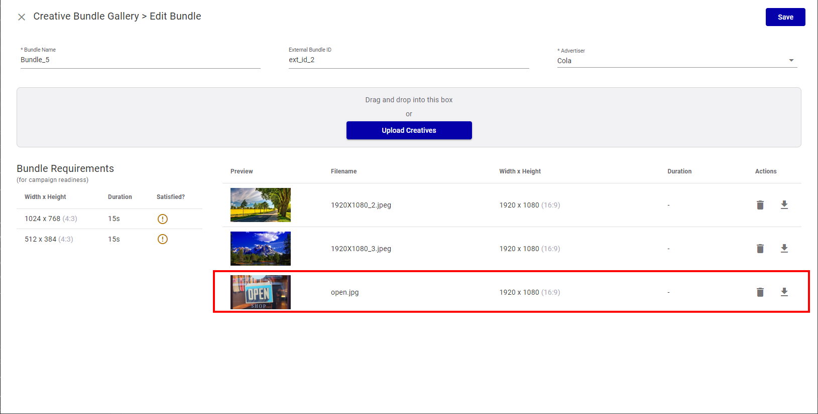 To delete a creative from a Bundle: