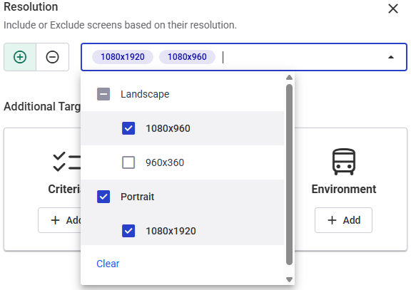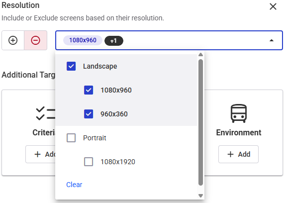 You can target screens in a digital line item according to their resolution (for example, 1080x1920). You can include or exclude specific screen resolutions from your targeting. You can create an unlimited number of targeting rules. Clicking the Select Resolution(s) drop-down menu reveals the list of available resolutions.