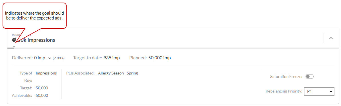 When using a shared goal, the goal is distributed across all the line items that use it. The goal distribution follows the specific of each Type of Buy allocation strategy. For example: