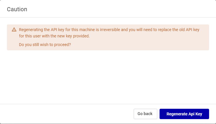 Warning: Regenerating the API Key is irreversible. You will need to replace the old API Key for this user with the new key provided.