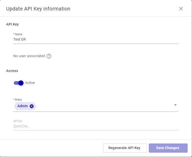 Note: If a user is associated with the API Key, you cannot modify the roles.