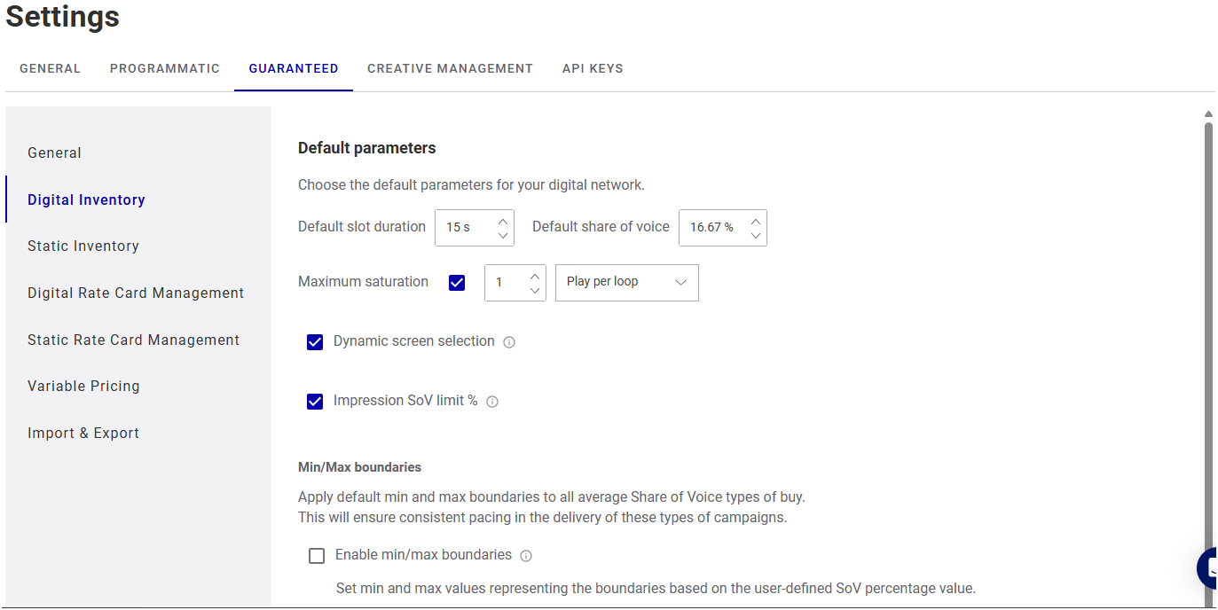 Note: Guaranteed Campaigns settings are available only to users assigned the Admin or Direct Sales Admin role. For more information, see User Permissions.