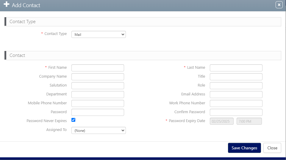 - Password Never Expires / Password Expiry Date – Enable the Password Never Expires check box to allow this contact to log in until this organization is no longer active. Otherwise, disable the check box and supply a Password Expiry Date and time of day.