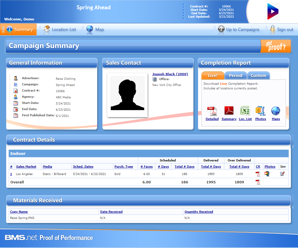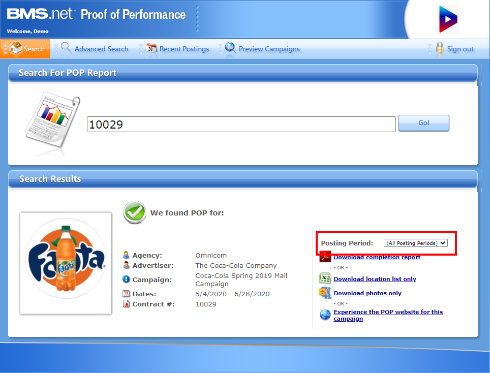Once published, the online POP Website includes posting photos, invoices, location information, posting versus scheduled dates, and override dates. You can also download a Zip folder containing all photos and download a completion report.