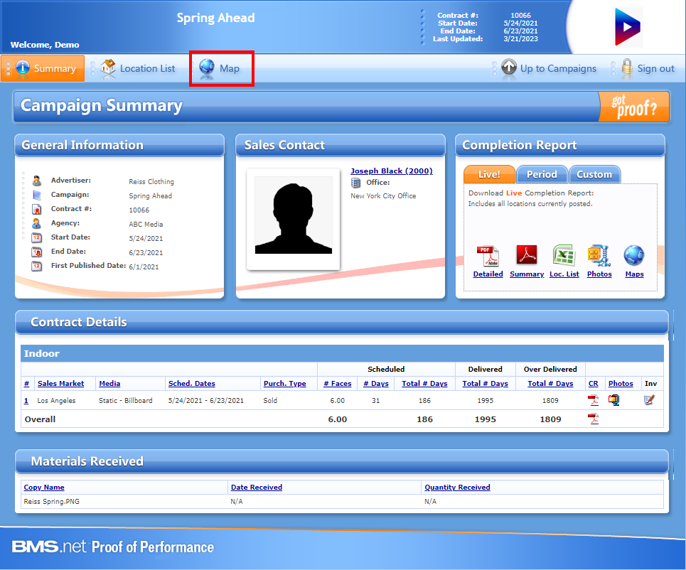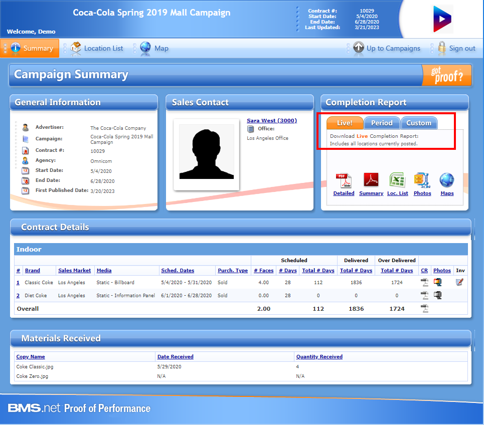 You can download a PDF completion report with location list, map, POP photos, and detailed copy information.