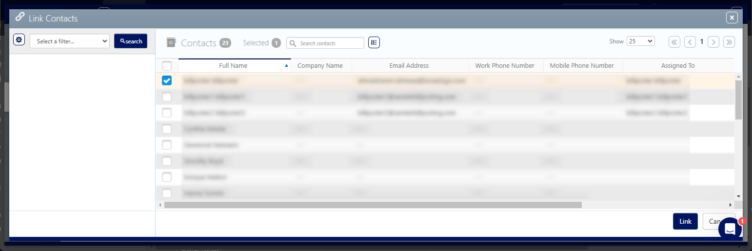 button to link a contact to this Account. - Choose the contact to link by selecting the check box next to it, then click the Link button.