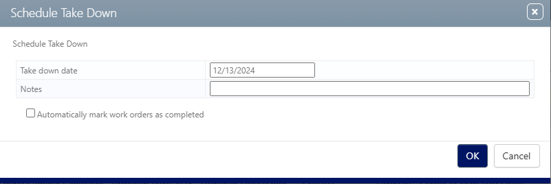 - This enables a Next button at the button of the screen: click it to open the Schedule Take Down dialogue box.