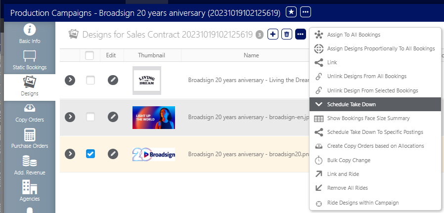 - Enable the check boxes for the design or designs that must have take downs scheduled.