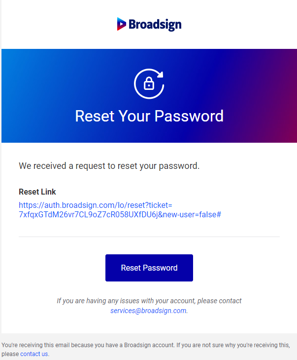 Note: If you encounter any issues, you can contact Broadsign Services directly by using the email provided or by clicking the contact us link at the bottom of the email.