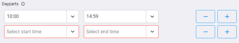 Vous permet d'ajouter jusqu'à 6 parties de la journée différentes. Si une tranche horaire est enregistrée sur la transaction, la transaction ne sera active que pendant cette période. Note : Toutes les tranches horaires affichées sont actives pendant les heures définies dans le fuseau horaire local de l'écran. |