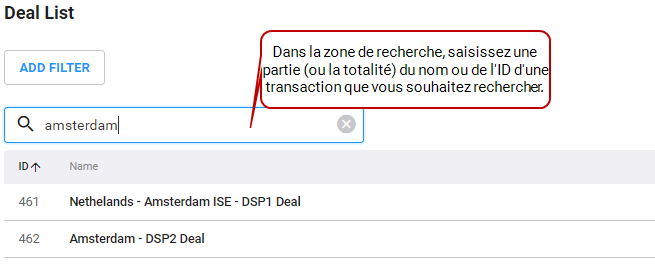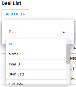 - Filtrer par champs spécifiques : Cliquez sur le bouton Add Filter en haut de la Deal List pour filtrer vos transactions en fonction d'un champ spécifique (colonne) que vous souhaitez filtrer.