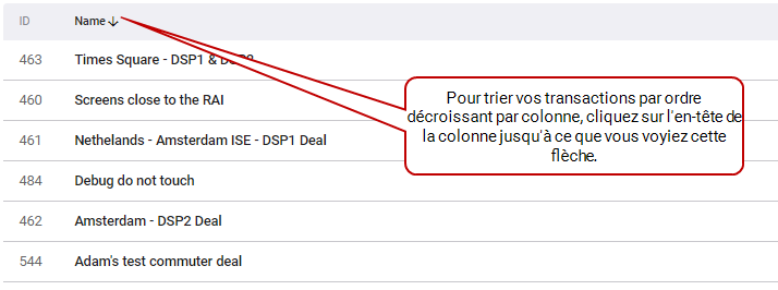 - Trier par en-tête de colonne : Par défaut, Broadsign SSP (Reach) trie les transactions selon leur ID. Pour trier les éléments dans une colonne spécifique, cliquez sur son en-tête. Pour inverser le tri, cliquez une seconde fois sur l'en-tête.