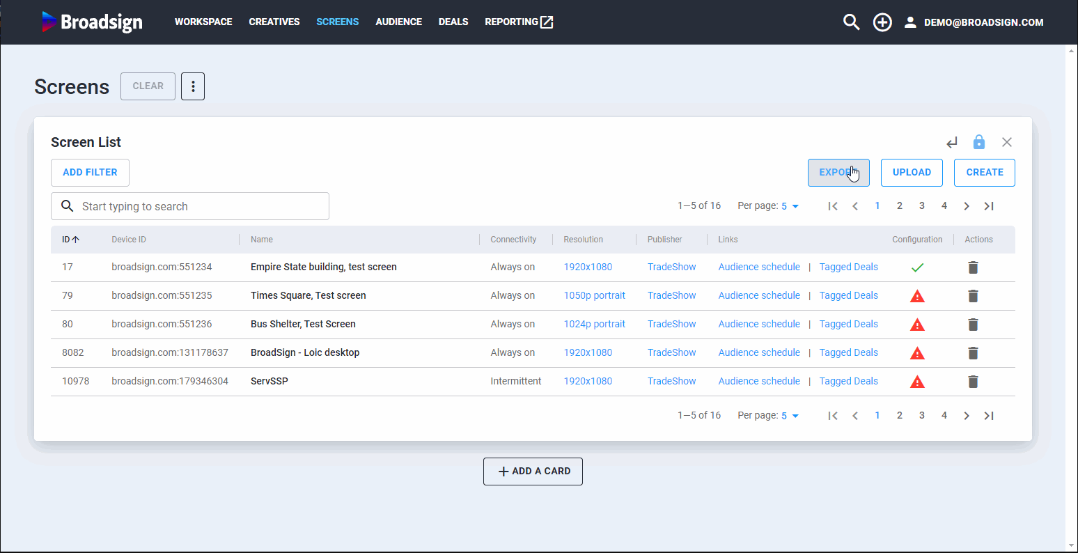 - Exporter le modèle de données d'écran depuis Broadsign SSP (Reach). Ce fichier vous fournit les colonnes autorisées et le format correct. Si votre éditeur n'a pas encore créé d'écrans, les colonnes seront vides.